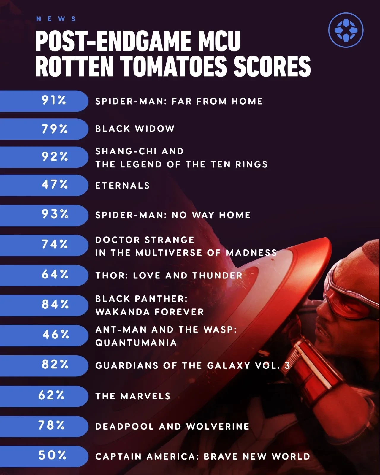 Издание IGN подтвердило выводы CinemaScore, подсчитав средний балл всех фильмов Marvel после «Мстителей: Финал». И новый «Капитан Америка» со средним баллом 50% по версии Rotten Tomatoes действительно занял почти нижнюю ступень — боевик «Человек-муравей и Оса: Квантомания» оказался ещё ниже в рейтинге со своими 46%.