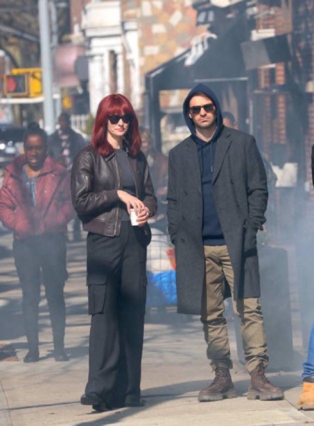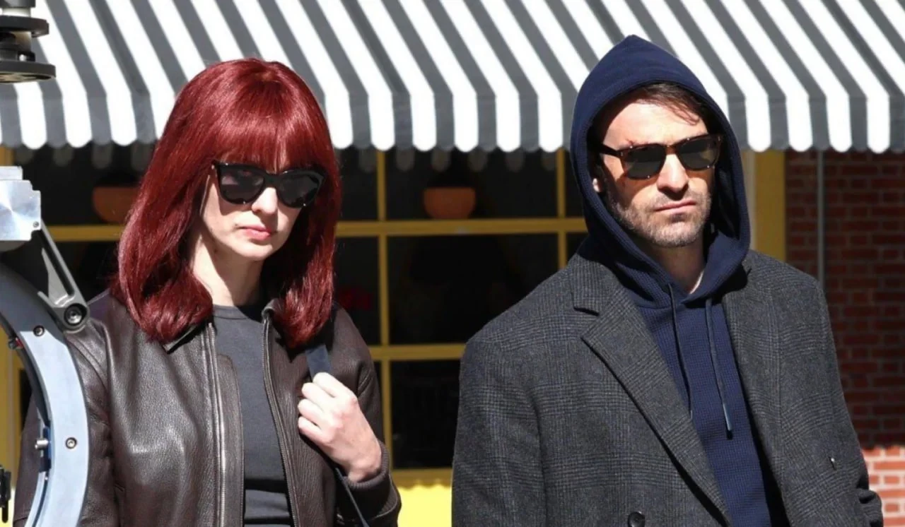 Судя по всему, героям в рамках сюжета нужно будет скрываться от кого-то, так как Карен носит яркий красный парик, а сам Мэтт скрывает лицо за очками и капюшоном.
