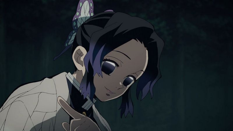 Брюнетка с хаори в виде бабочки из аниме «Клинок, рассекающий демонов» слаба физически и не может уничтожать демонов при помощи меча. Зато Синобу Котё знает фармацевтику и создает сильные яды, а также умеет фехтовать. Хрупкая девушка посвящает себя борьбе с демонами. У Синобу редкий черный цвет глаз с фиолетовым оттенком. Обычно одета в «боевую» одежду и носит с собой меч. Владеет особыми стилями фехтования — «танцем бабочки», «танцем стрекозы».