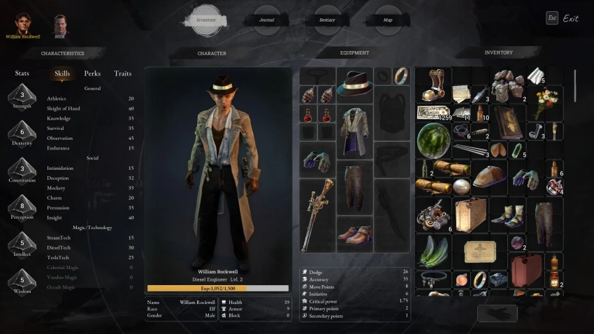 Так выглядит инвентарь главного героя: при желании вещи можно передавать спутникам. Здесь же есть шкала опыта: при повышении уровня мы можем улучшать характеристики героев.