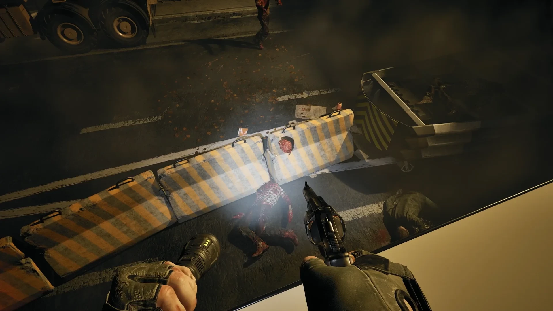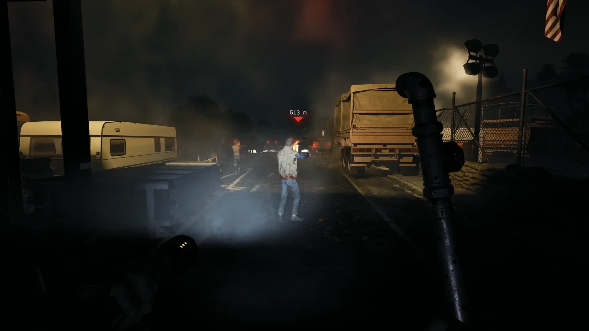 Но пока что — ночь и тишина, за исключением криков редких умирающих и голоса из рации. Фонарик поможет сориентироваться в пространстве, шесть патронов в револьвере пригодятся только в крайнем случае, а с агрессивным зомби-одиночкой поможет справиться оружие ближнего боя.