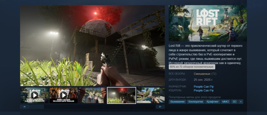 В Steam новинка получает смешанные отзывы: она нравится только 66% покупателей (на основе 72 обзоров). Пиковый онлайн Lost Rift один из самых низких среди игр People Can Fly — 865 человек одновременно. У шутера есть шанс привлечь больше людей на выходных.