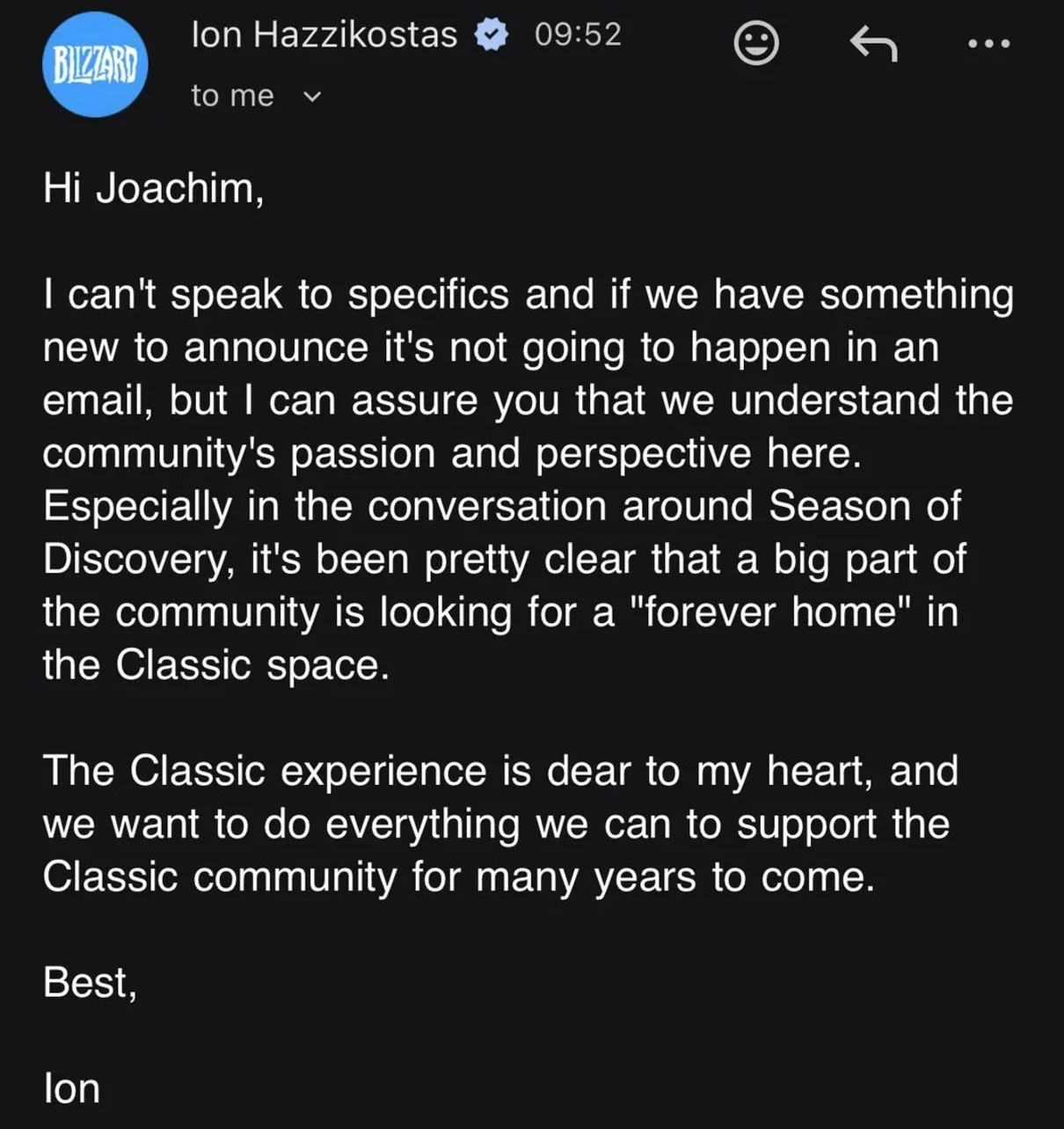 Конечно, Хаззикостас не дал конкретики. Он объяснил, что если у студии и есть новости, то сообщат об этом явно не так. И всё же геймдиректор успокоил поклонника «Классики», заверив, что в Blizzard понимают нужды сообщества.
