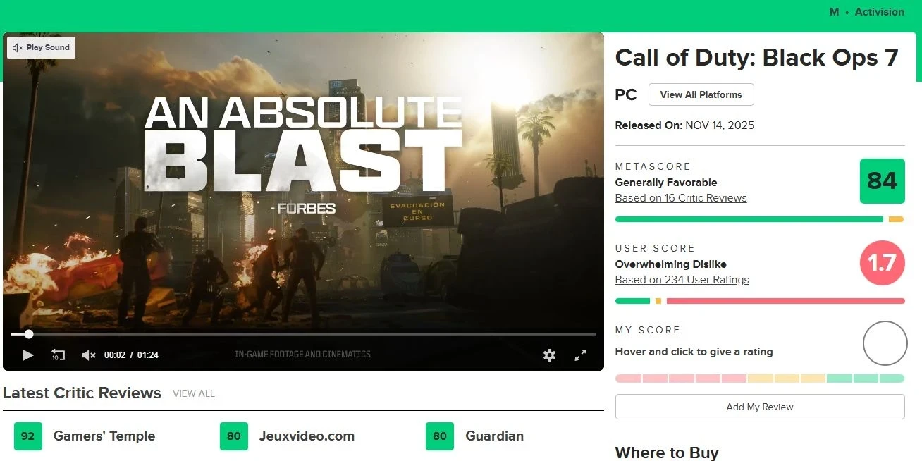 Call of Duty: Black Ops 7 установила антирекорд по оценкам пользователей на Metacritic