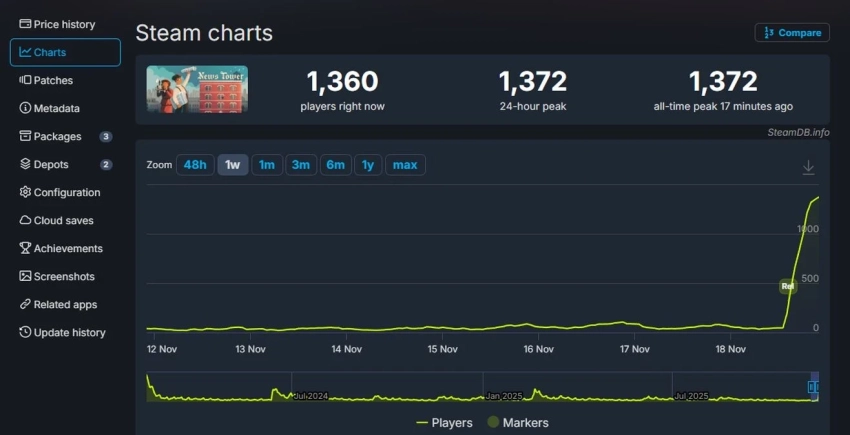 На момент публикации новости рейтинг News Tower в Steam составляет 96%. А вот пиковый онлайн у неё совсем скромный — 1372 одновременных пользователя, причём свой рекорд игра обновила всего 16 минут назад.