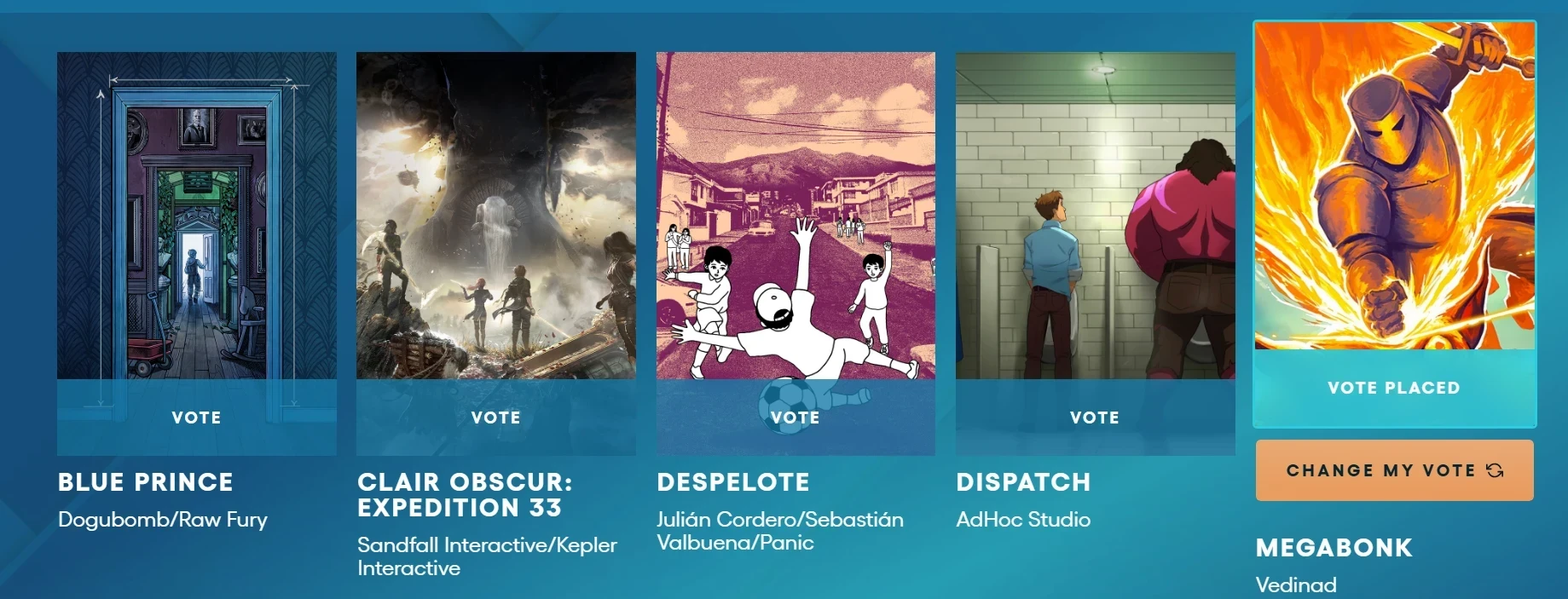 Кстати, на момент написания официальный сайт TGA всё ещё не обновили, и за Megabonk можно голосовать. В категории «Лучший инди-дебют» также номинированы: Blue Prince, Clair Obscur: Expedition 33, Despelote и Dispatch.