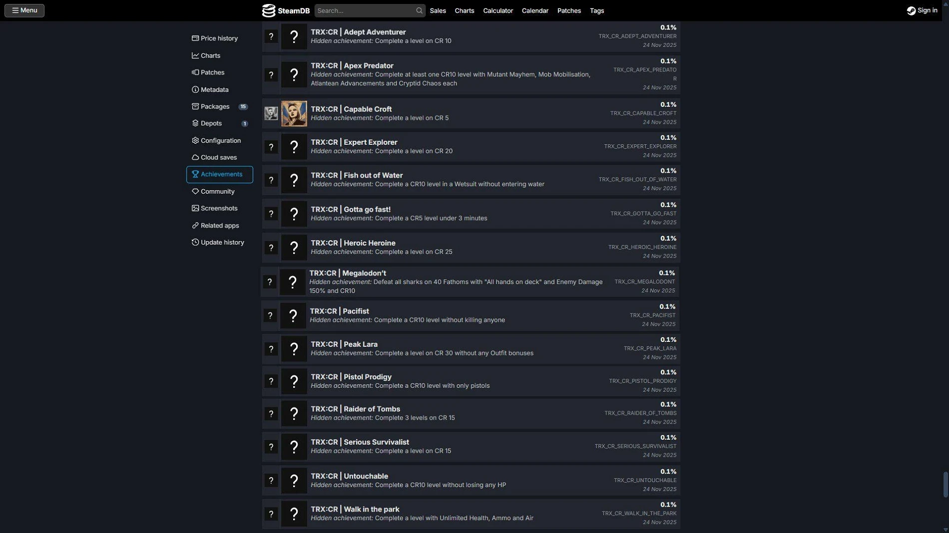 Они связаны с прохождением уровней с пометкой CR и различными испытаниями. Например, есть ачивки за «завершение уровня CR5 за 3 минуты», «завершение уровня CR10 без убийств» и «завершение уровня на CR 30 без костюмных бонусов».