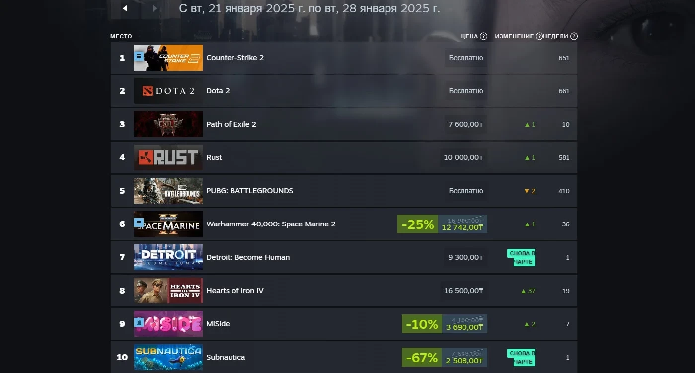 Закрывает первую десятку выживалка Subnautica, а впереди неё идёт нашумевшая MiSide за авторством отечественных разработчиков. Также на шестом месте стоит отменить брутальный экшен Warhammer 40,000: Space Marine 2, который получил скидку в 25% от стандартной цены.