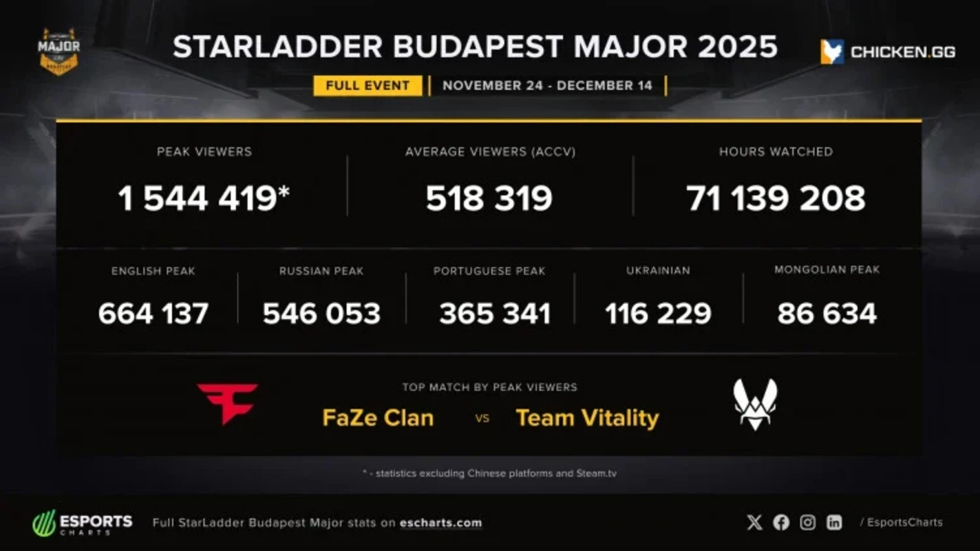 Источник: StarladderЗавершившийся в Венгрии StarLadder Budapest Major 2025 по Counter-Strike 2 показал впечатляющие цифры зрительской активности. По данным аналитического сервиса Esports Charts, пиковый онлайн на трансляциях турнира достиг отметки в 1,54 млн человек.