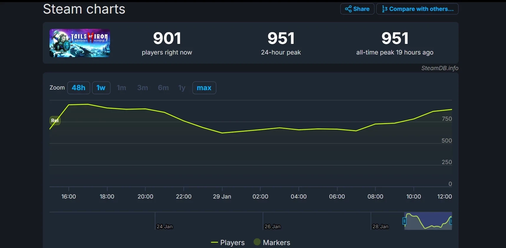 Что касается пикового онлайна в Steam, то в игре находился 951 игрок одновременно. Для сравнения, пиковый онлайн первой части превысил 1,5 тысячи человек. Прямо сейчас Tails of Iron 2: Whiskers of Winter можно купить с временной скидкой 20% в Steam — она продлится до 11 февраля.