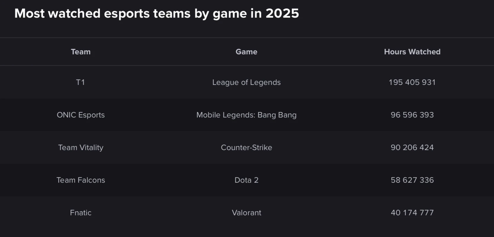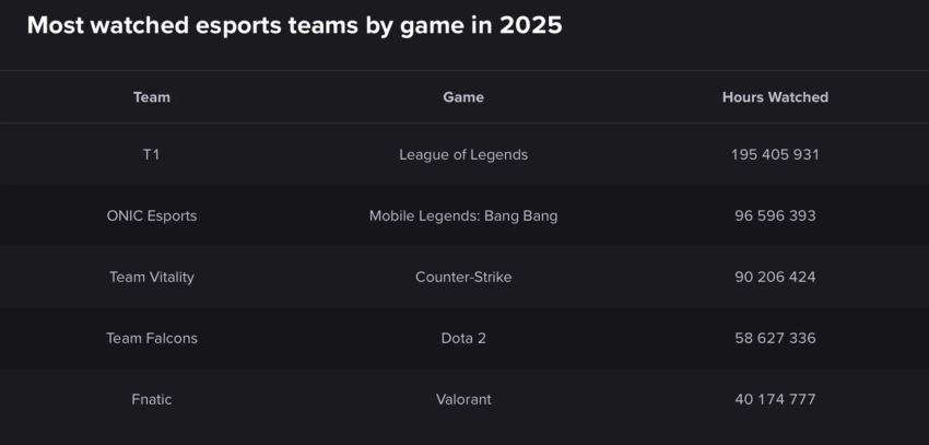 Источник: StarladderФранцузская организация Team Vitality стала абсолютным лидером по зрительскому интересу в дисциплине Counter-Strike 2 по итогам 2025 года. Согласно отчету аналитического портала Esports Charts, матчи с участием «пчел» собрали наибольшее количество часов просмотра.