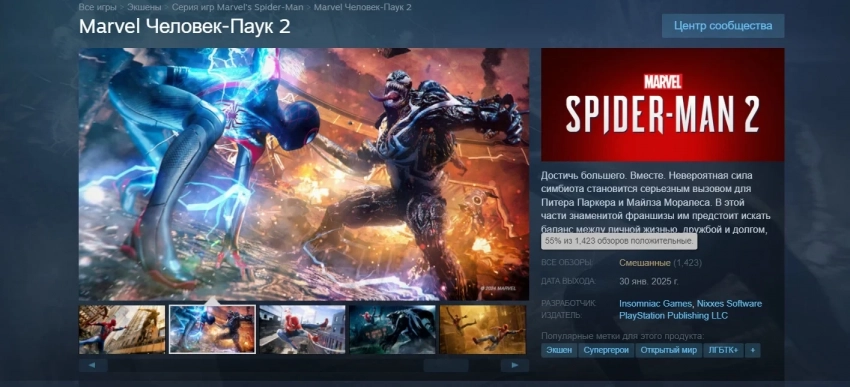 Кроме того, Marvelʼs Spider-Man 2 получила «смешанный» рейтинг в Steam на основе чуть более 1,4 тыс обзоров.
