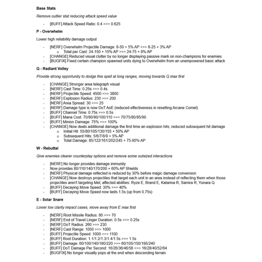 Источник: LoLКомпания Riot Games опубликовала список изменений для частичной переработки Мэл в League of Legends, которая вступит в силу с выходом патча 26.3 (16.3). Разработчики преследуют две цели: сделать противодействие чемпиону более «читаемым» и сместить мету прокачки с максимизации E (контроль) на Q (урон).
