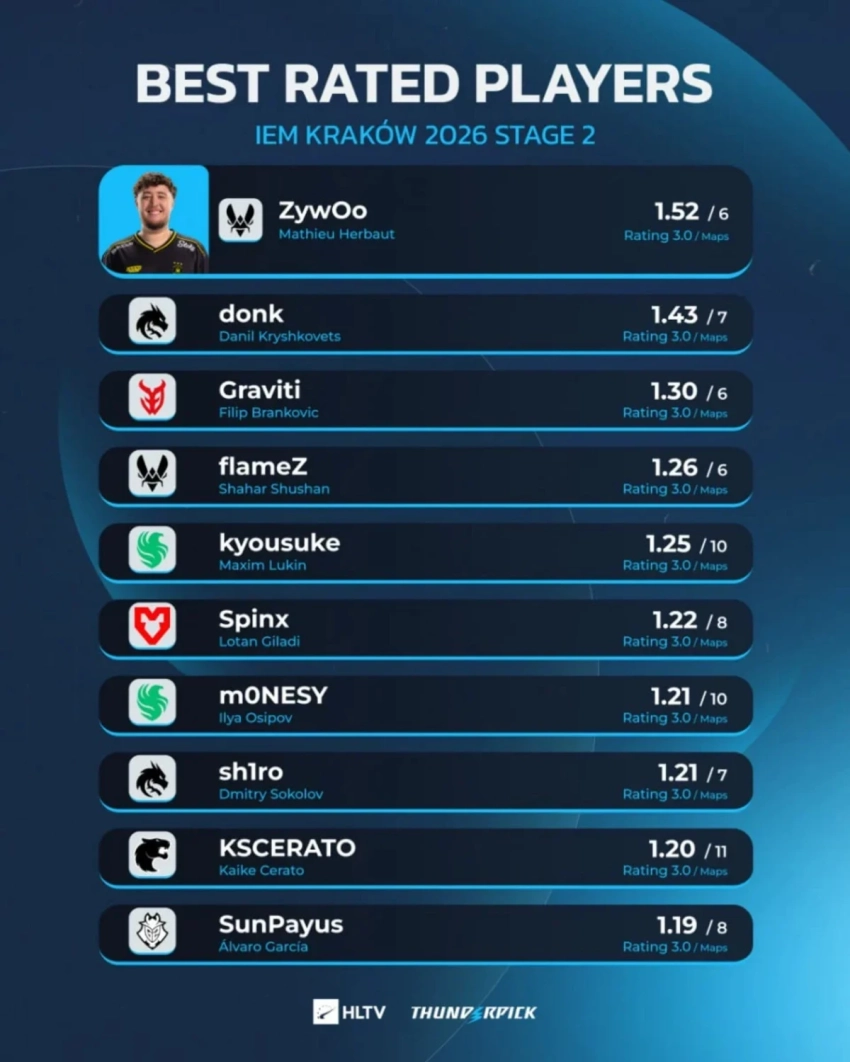 ZywOo обошел donk и стал лучшим игроком групповой стадии IEM Kraków 2026 по Counter-Strike 2