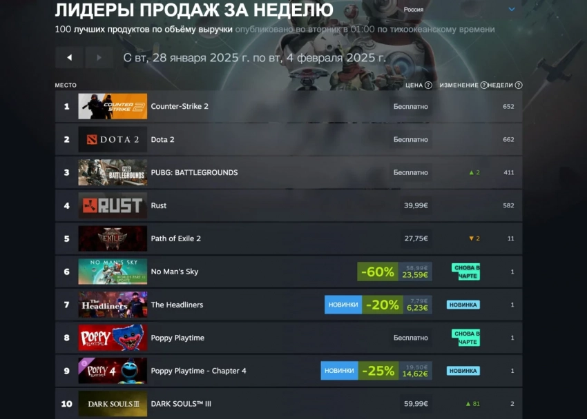 В чарте России перестановки в основном произошли во второй половине топа — в подборку вернулись No Man’s Sky (6 место) и Poppy Playtime (8 место), причём последней помог релиз свежей четвёртой главы (у неё 9 позиция).