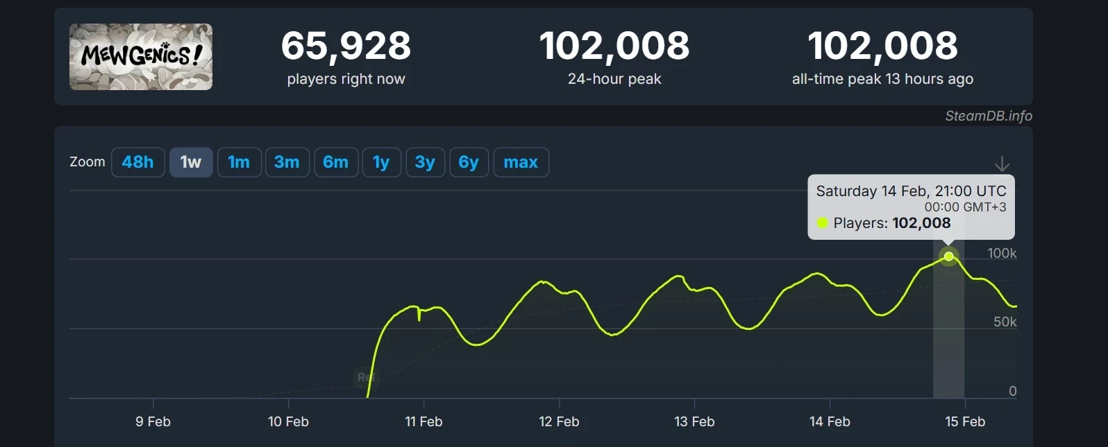 В день релиза 10 февраля пиковый онлайн Mewgenics лишь слегка превысил 65 тысяч игроков. При этом за первые 12 часов продажи игры составили 250 тысяч копий, а на второй день тираж перевалил за полмиллиона. Вероятно, популярности способствовала не только слава автора The Binding of Isaac, но и сарафанное радио вкупе с восторженными обзорами журналистов.