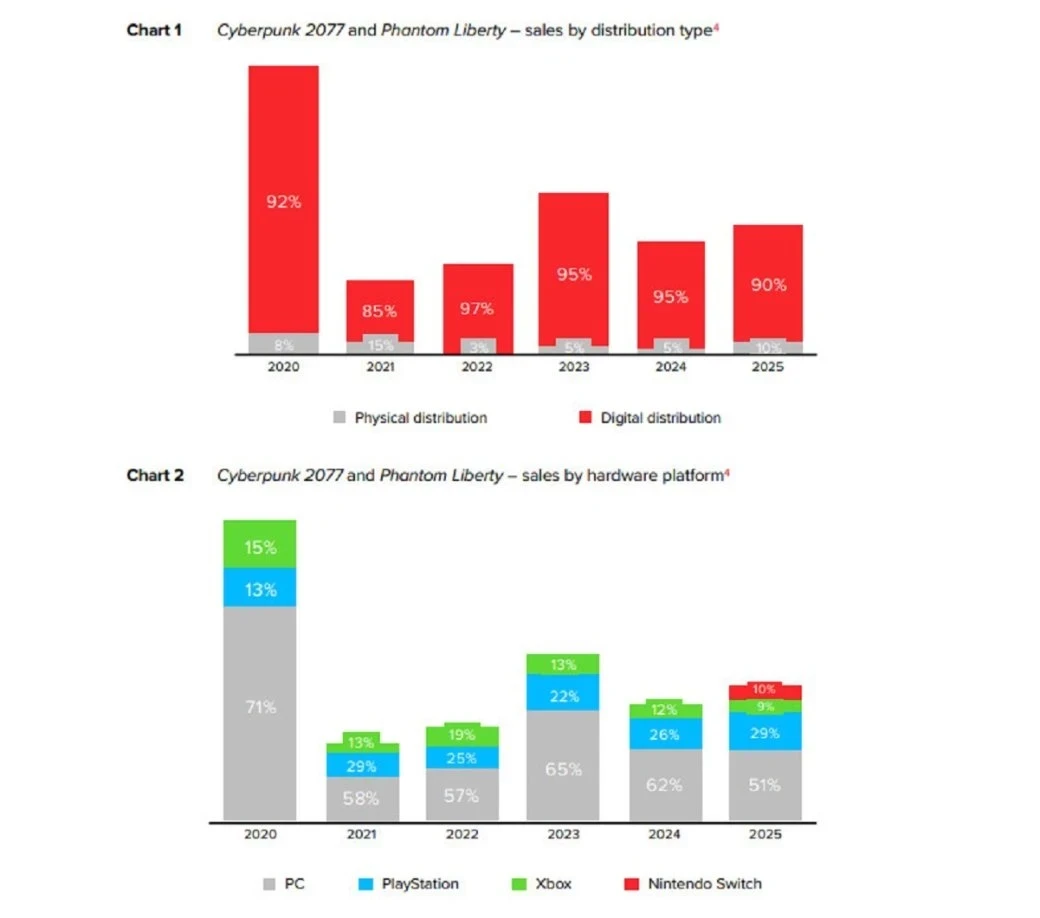 Увы, CD Projekt не стала обновлять данные по продажам своих игр — они актуальны на 26 ноября 2025 года. Тираж Cyberpunk 2077 превысил 35 миллионов копий, а дополнения Phantom Liberty — 10 миллионов. Причём в 2025 году интерес покупателей к «Киберпанку» вырос в сравнении с 2024 годом, возможно, из-за порта на Nintendo Switch 2.