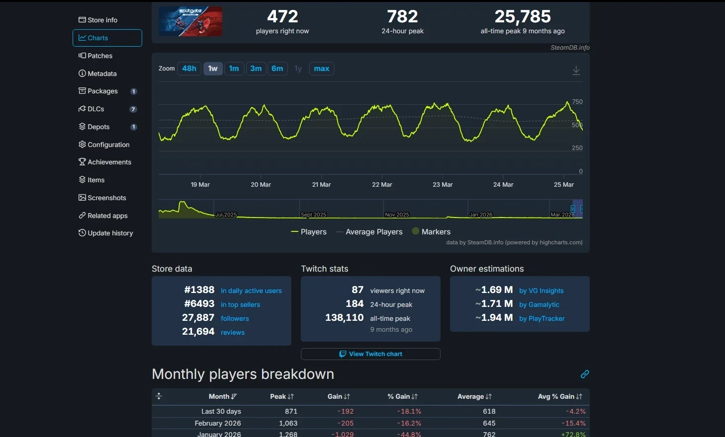 А 2 сезон Splitgate: Arena Reloaded с новыми картами, оружием и другим контентом стартует уже 27 марта. Поможет ли он увеличить аудиторию шутера — сказать сложно. В марте его пиковый онлайн в Steam достиг не достиг и 900 игроков.