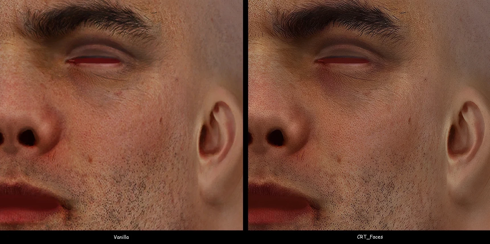 Увы, в данный момент бесплатный мод CRT_Skins улучшает лишь лица персонажей. Их текстура растягивается до формата 4К, не теряя в детализации. Такие важные аспекты, как одежда и снаряжение NPC, остались нетронутыми. Не исключено, что моддер возьмётся за их улучшение в случае востребованности CRT_Skins.
