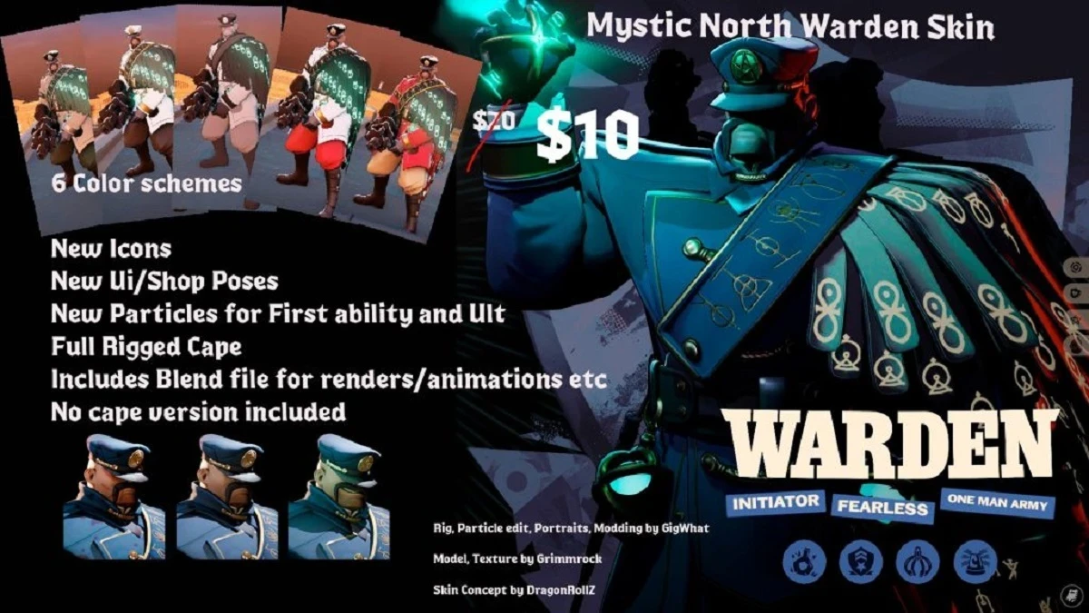 Геймеры обратили внимание на моддера под ником GigWhat, который продаёт облик «Mystic North» для героя Warden. Цена вопроса — 20 долларов. Моддер предлагает «6 цветовых схем, полностью анимированный светящийся плащ, новые эффекты способностей и пользовательские иконки интерфейса».