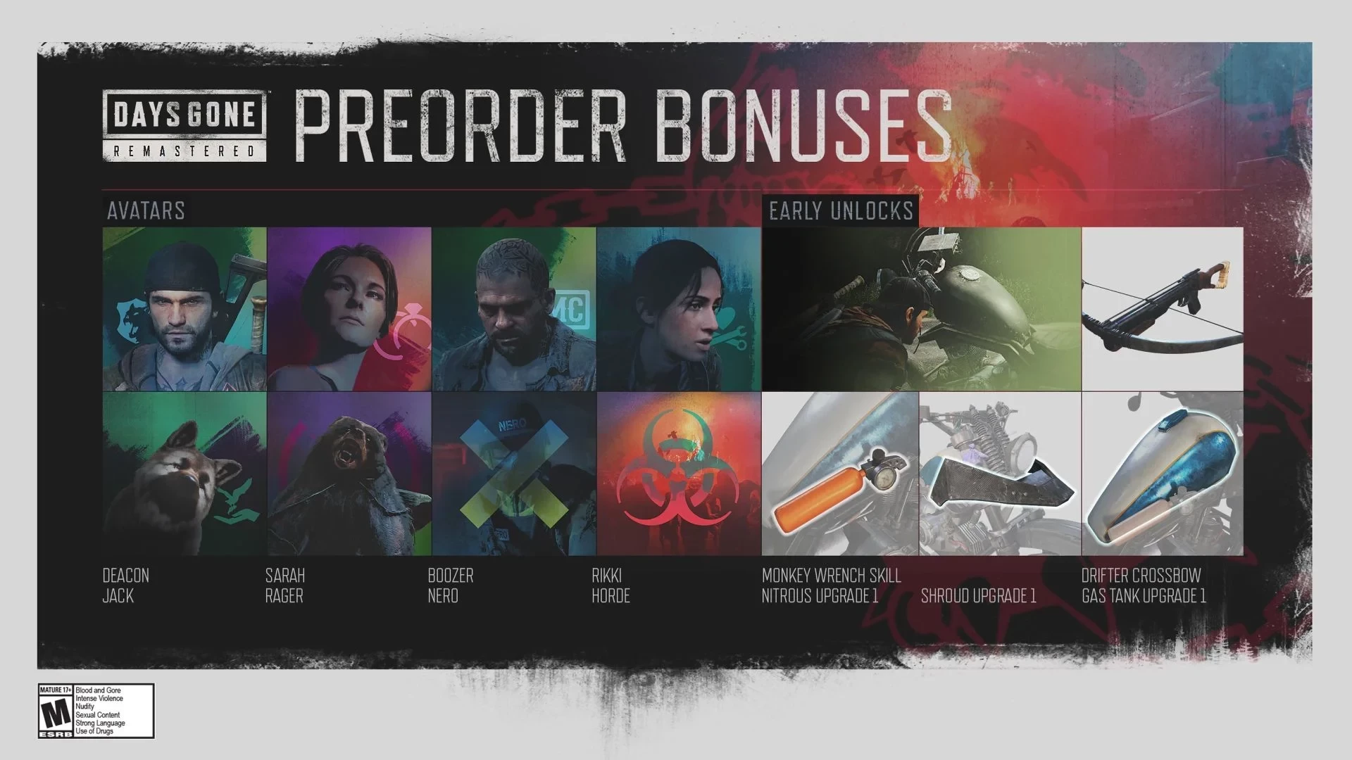 Приём предварительных заказов Days Gone Remastered уже стартовал. Как мы знаем, для владельцев игры улучшение будет стоить 10 долларов. Все остальные могут купить игу за 50 долларов. Бонусом предзаказа стали набор аватаров и ряд ранних разблокировок. А релиз ремастера назначен на 25 апреля.