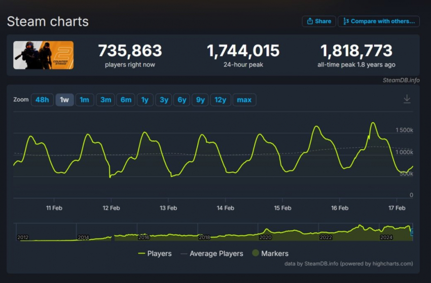 При этом рекордный общий пиковый онлайн всё ещё принадлежит Counter-Strike: Global Offensive — это 1 818 773 игроков одновременно. Показатель зафиксировали в мае 2023 года года. А с марта 2023 года Valve как раз начала проводить ограниченный тест CS2.