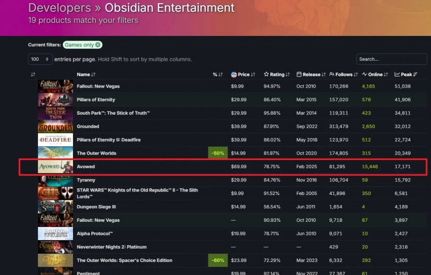 При этом Avowed пока не смогла обойти обе части Pillars of Eternity, The Outer Worlds и некоторые другие игры Obsidian Entertainment в Steam по пиковому онлайну. Вот так выглядит текущий топ-10:
