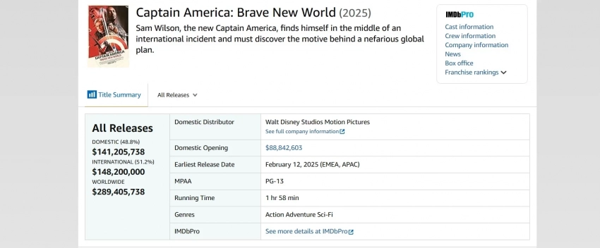 Во всём мире «Капитан Америка: Новый мир» заработал 289,4 млн долларов: