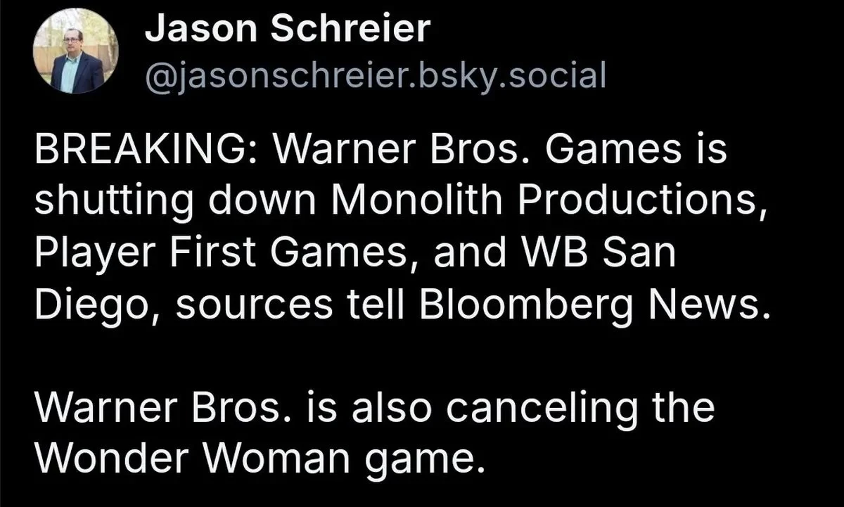 Оригинальная новость. Как сообщил Джейсон Шрайер из Bloomberg со ссылкой на свои источники, компания Warner Bros проводит массовое урезание расходов. На этот раз его жертвой стали сразу три студии: Monolith Productions, Player First Games и WB San Diego.