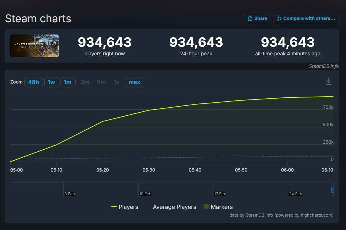 Пиковый онлайн Monster Hunter Wilds в Steam приблизился к 1 млн игроков одновременно