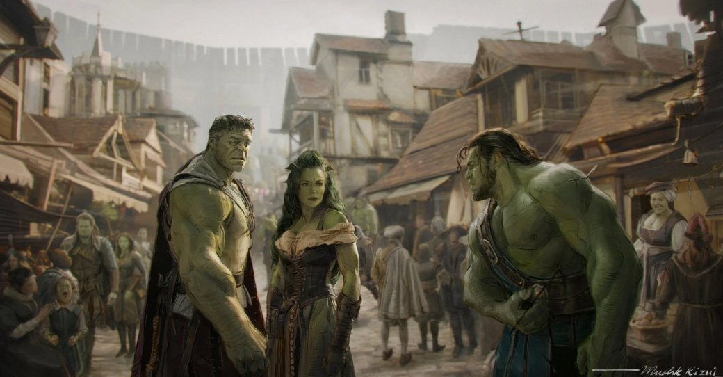 Ещё по арту с Доктором Думом можно заметить преобладание готической и средневековой тематики. Ей посвящена весомая часть концептов со знакомыми героями. Например, на одном из таких Дум восседает на троне перед неким провинившимся холопом. На другом можно увидеть Халка, который находится посреди города за громадной стеной.