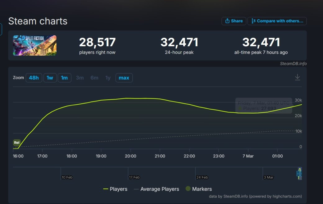 Поэтому заглянем в Steam. Здесь пиковый онлайн новинки достиг 32 471 игроков одновременно. Это ставит Split Fiction между It Takes Two (71 039 игроков) и A Way Out (8 582 игроков).