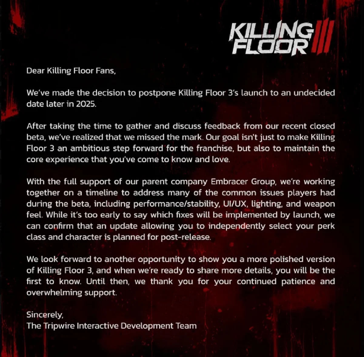 «Мы с нетерпением ждём новой возможности показать вам более совершенную версию Killing Floor 3, и когда мы будем готовы поделиться более подробной информацией, вы узнаете её первыми. А пока мы благодарим вас за ваше неизменное терпение и безграничную поддержку», — заявили разработчики.