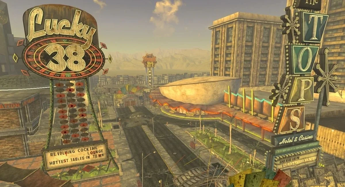 5 фотоИгроки Fallout: New Vegas легко узнают на фотографиях казино «Лаки 38», принадлежащее мистеру Хаусу — неприступную крепость, которая устояла даже во время ядерной атаки. Другая знаменитая локация — «Топс», открытое для посетителей казино с театром, которым заправляет Бенни.