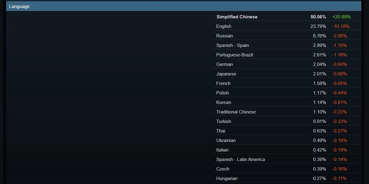 Для сравнения, количество англоязычных аккаунтов за февраль сократилось более чем на 10% и сейчас составляет 23,79%. Третье место по популярности занимает русский язык (6,76%). Это объясняет, почему издатели всё чаще публикуют русскоязычные страницы своих игр, даже если не готовят локализацию и даже запрещают продажу на территории России.