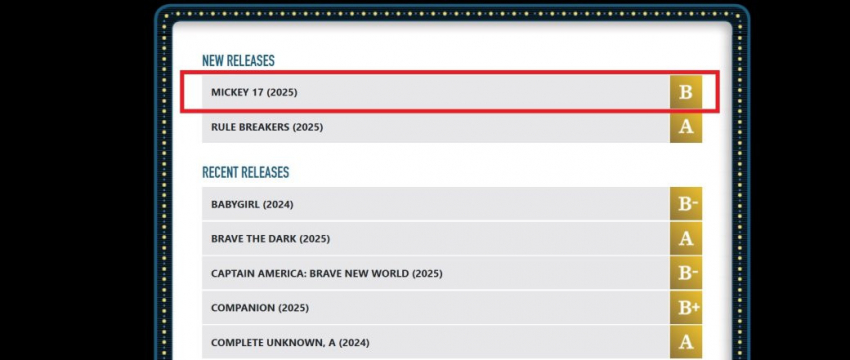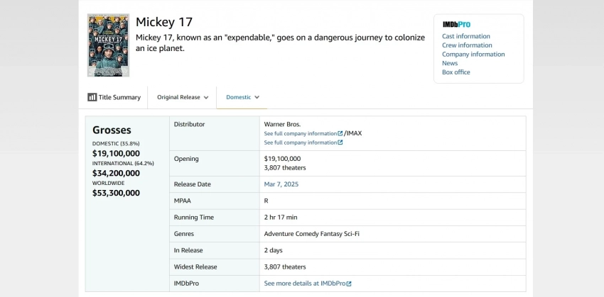 Начало, как видно, положено не очень хорошее. На CinemaScore «Микки 17» получил отметку «B», а на агрегаторе Rotten Tomatoes — 78% рейтинга.