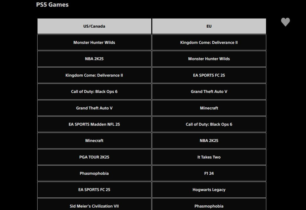 Например, возьмём Европу. Среди игр на PS5 там чаще всего загружали Kingdom Come: Deliverance 2, тогда как среди прошлого поколения в центре внимания оказалась первая Kingdom Come: Deliverance 2. В США и Канаде на актуальных консолях предпочли Monster Hunter Wilds (она же занимает второе место в Европе) и NBA 2K25 — приключения Индржиха лишь закрывают тройку. В Европе эта участь досталась EA Sports FC 25.