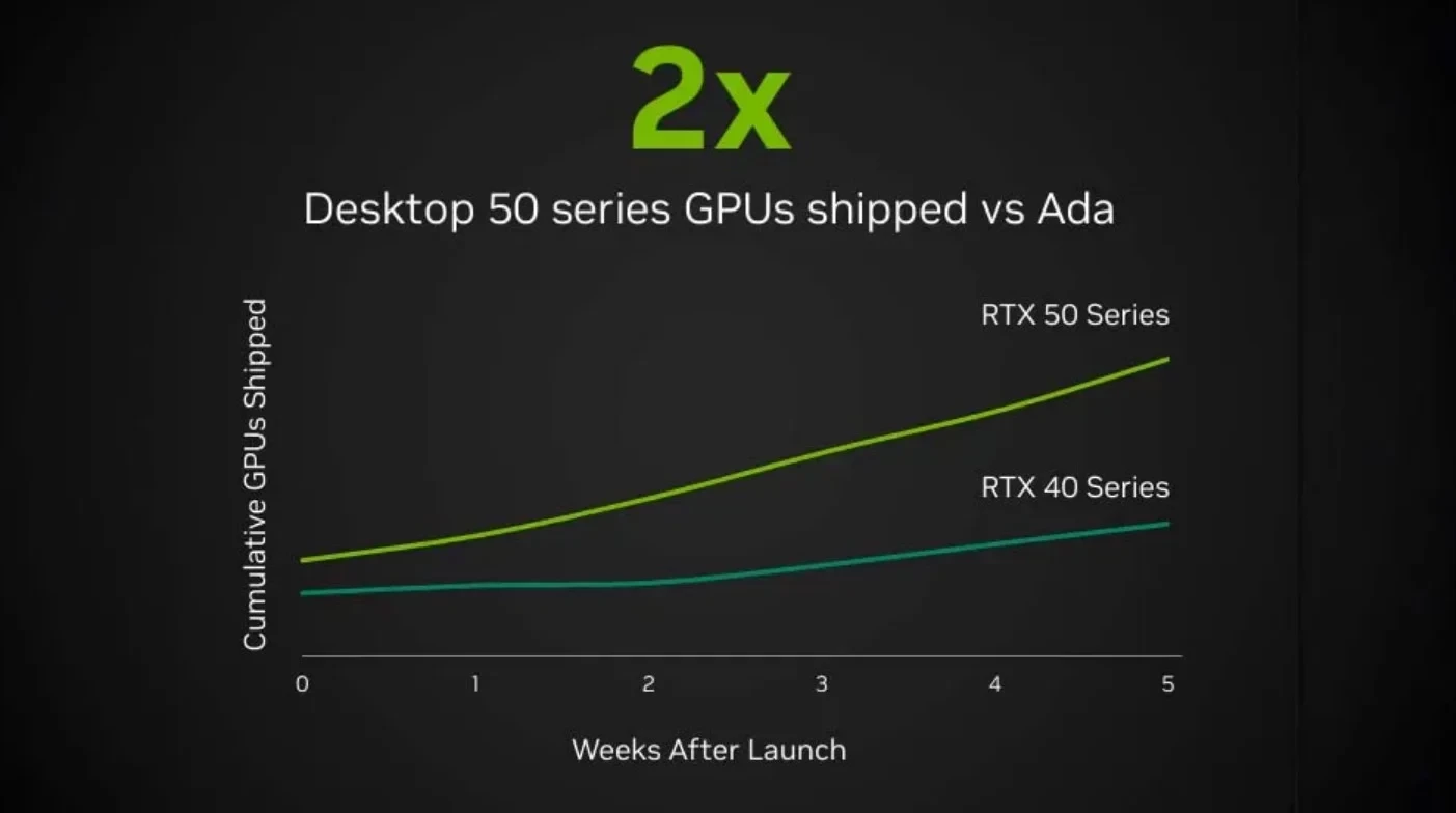 На бумаге показатели действительно выглядят хорошо — раскритикованные экспертами видеокарты продались лучше, чем прошлое поколение. Если же углубиться в контекст, то становится очевидно: в сравнение идёт сразу четвёрка видеокарт 50-й серии, которые появились за пять недель. При этом у 40-й серии за аналогичный период в продаже были лишь RTX 4090 и RTX 4080.