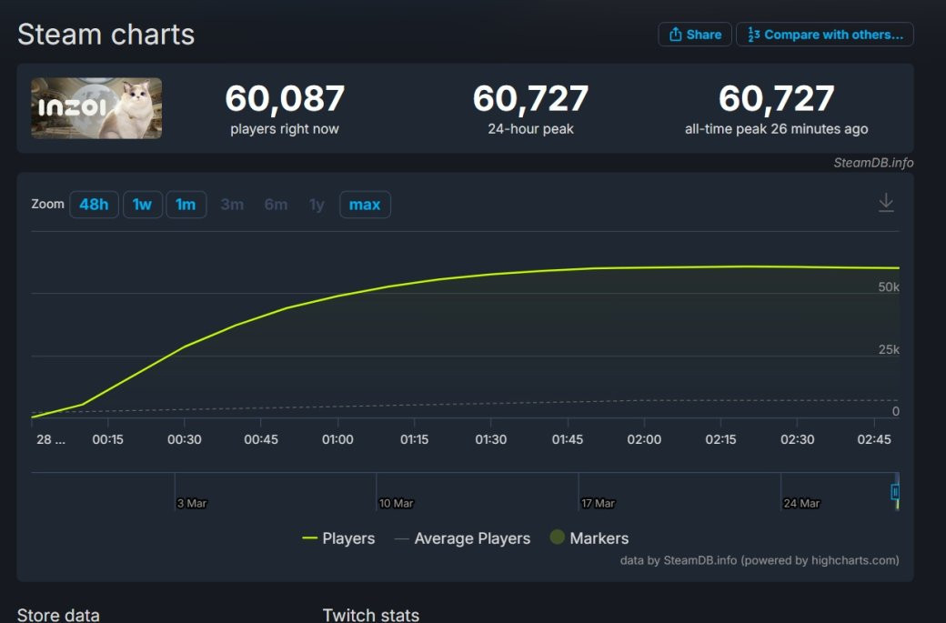 Пиковый онлайн inZOI составляет 60 727 человек и продолжает расти. У новинки есть шанс обогнать по этому показателю The Sims 4, которая за всё время доступа в Steam привлекла 96 328 игроков одновременно.