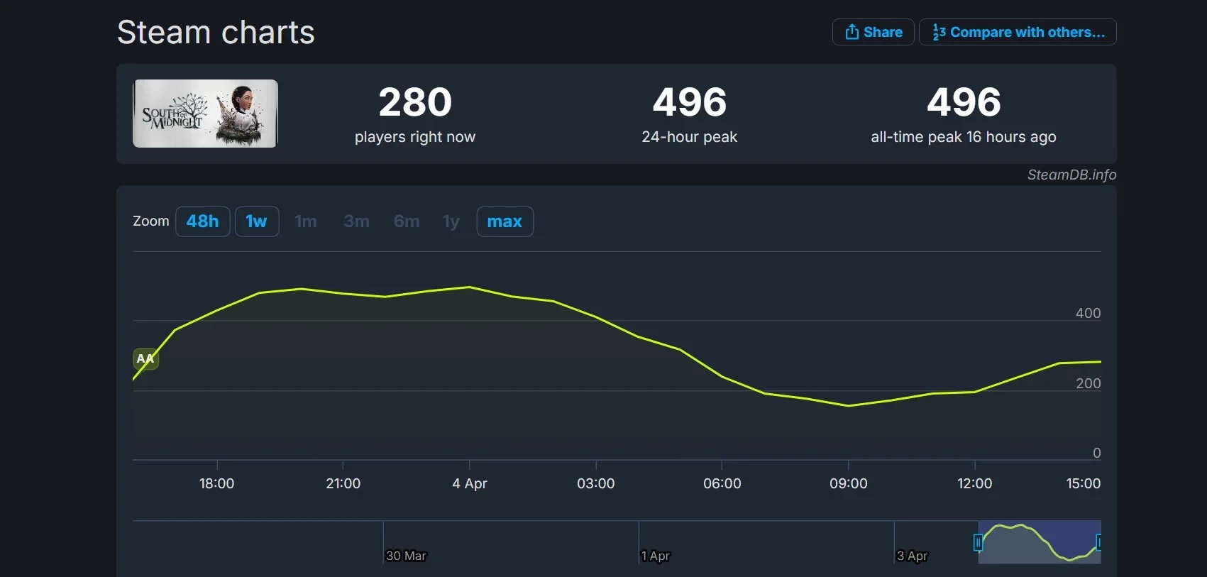 Что касается пикового онлайна в Steam, то он составил 496 человек. Не густо, но, вероятно, рекорд может быть побит в момент полноценного релиза. Каких-то заоблачных цифр ждать не стоит, ведь South of Midnight пополнит подписку Game Pass.