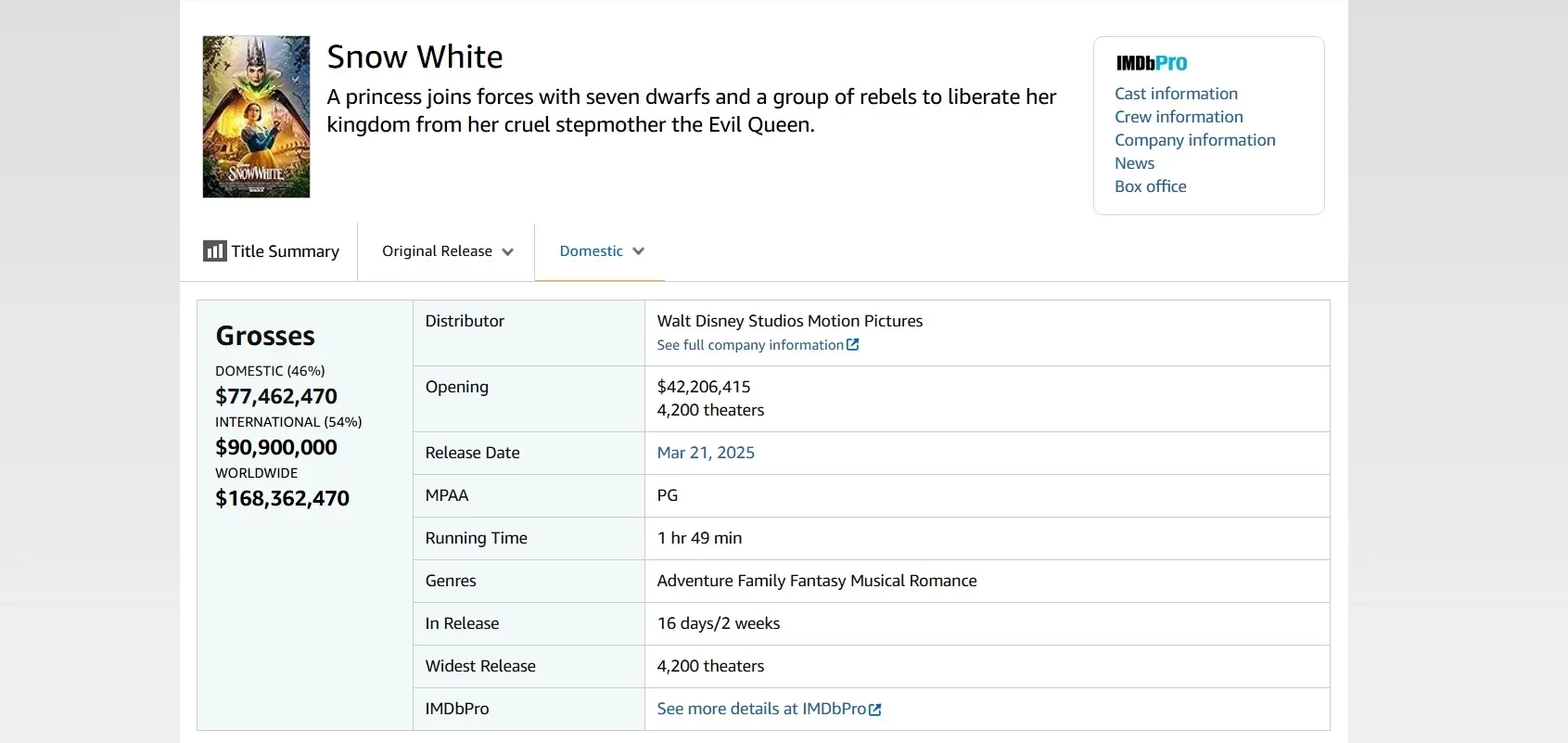 Тем временем новая «Белоснежка» с Рэйчел Зеглер и Галь Гадот продолжает свой путь одного из крупнейших провалов Disney и этого года. Очередная неделя в домашнем прокате принесла фильму ещё 6,1 млн долларов, а общая сумма сборов составила 168 млн долларов.
