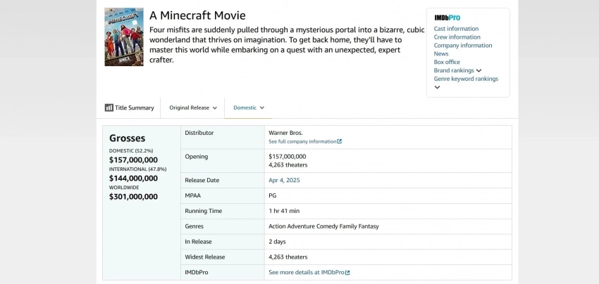 «Minecraft в кино» — 157 млн долларов в США (301 млн долларов в мире);