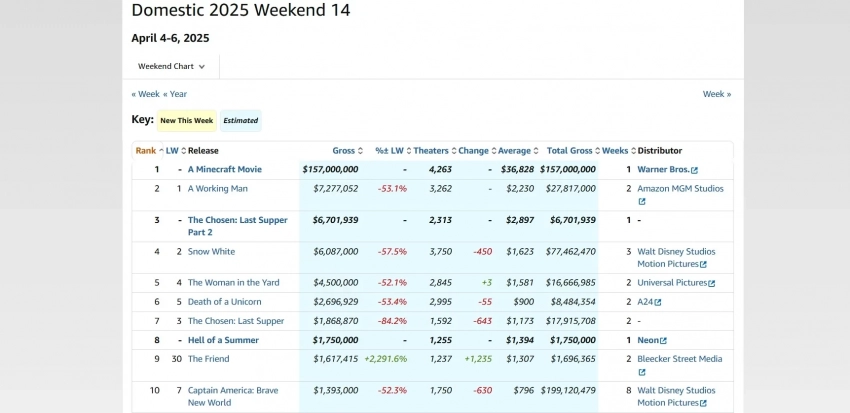Свежий топ-5 кассовых сборов в прокате в США за период с 4 по 6 апреля 2025 года: