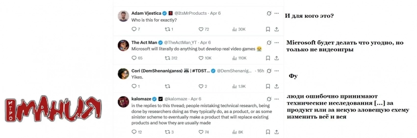 Ещё больше интересных видео на YouTube канале Игромании!Обложка: скриншот игры Quake 2Ранее в этом году Microsoft представила Muse — новую модель искусственного интеллекта в помощь разработчикам игр. Глава компании Сатья Наделла, по его собственным словам, испытал «вау-эффект» от возможностей технологии и захотел создать каталог игр с генеративным ИИ.