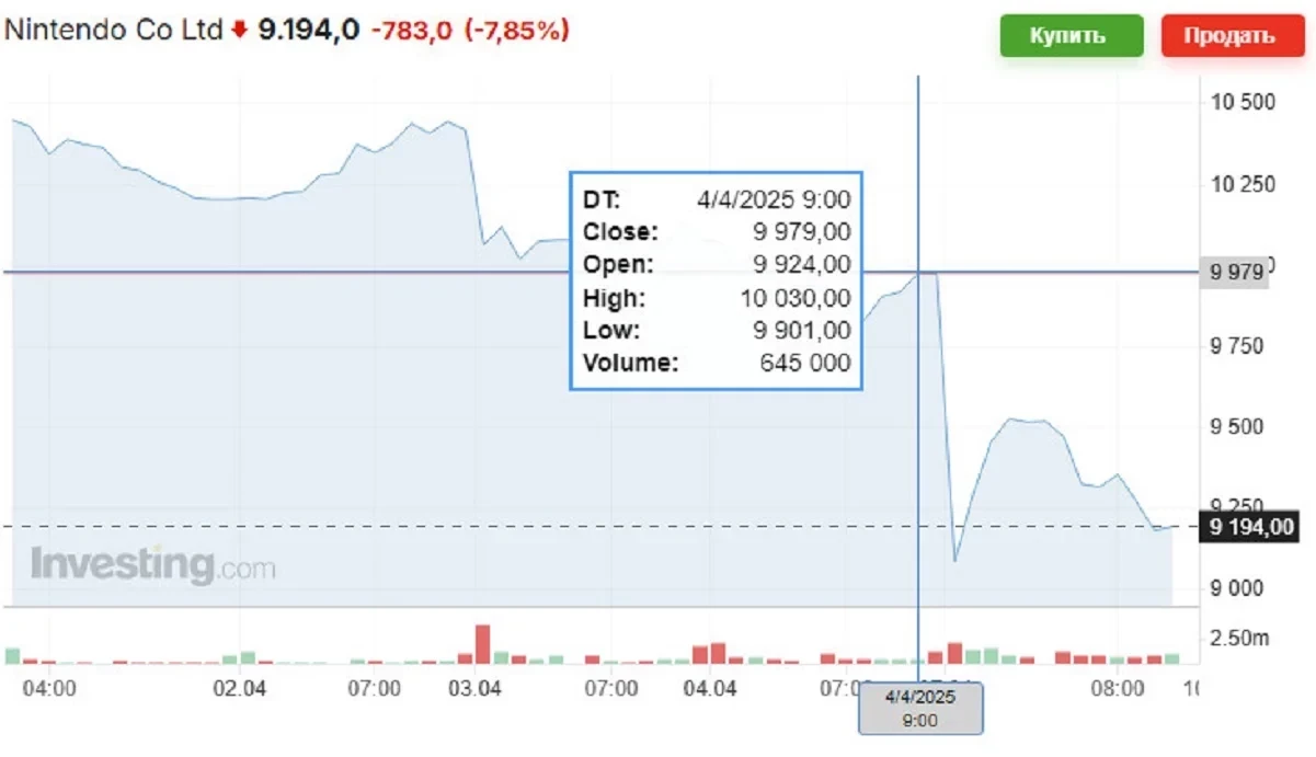 Сегодня, в день открытия торгов на японской бирже, акции Nintendo упали на 7,85% (в момент написания новости) до 9.194 йены. В 2025 году это не рекордно низкая стоимость, однако она близка к этому значению. Причём своей максимальной стоимости в этом году компания достигла в феврале — тогда цена акции превысила 11 йен.