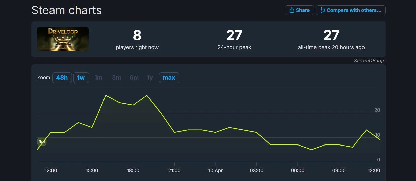 Что касается пикового онлайна, то он соответствует нишевой игре. Рекорд Driveloop: Survivors — 27 одновременных игроков.