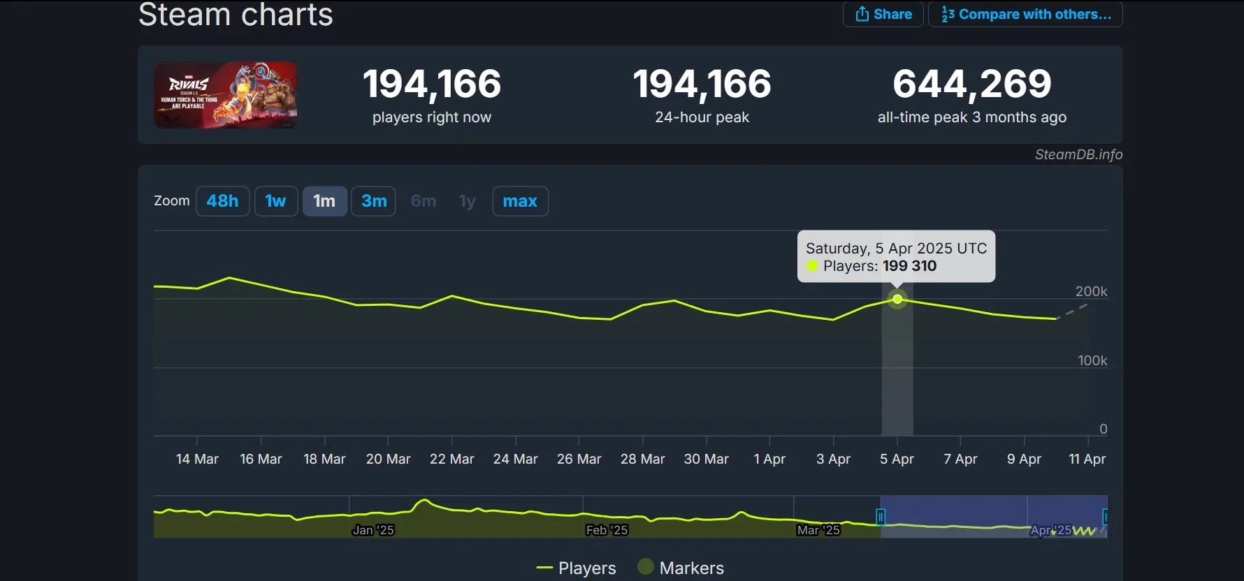 Ни для кого не секрет, что тесное взаимодействие с сообществом и первоисточник в лице комиксов Marvel обеспечили шутеру невероятный успех — игра даже увела почти половину аудитории Overwatch. Из-за всего этого онлайн Marvel Rivals остаётся стабильным (хоть и не таким высоким, как в декабре, когда шутер только вышел).
