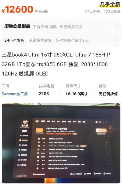Продавец предлагает Galaxy Book 4 Ultra с модельным номером 960XG за 12 600 юаней ($1780). В составе ноутбука имеется процессор Core Ultra 7 155H из серии Meteor Lake, 32 Гбайт оперативной памяти LPDDR5-7467, твердотельный накопитель объёмом 1 Тбайт, а также дискретная видеокарта GeForce RTX 4050 с 6 Гбайт памяти GDDR6. Также указывается, что ноутбук оснащён OLED-экраном с разрешением 2880 × 1800 пикселей и частотой обновления 120 Гц.