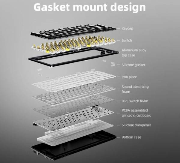 FiiO KB3 собрана в корпусе из алюминиево-магниевого сплава. В ней используются жёлтые переключатели Gateron G Pro 3.0, прозрачные колпачки клавиш, а также имеется RGB-подсветка. На правой стороне клавиатуры расположено колёсико для регулировки громкости.