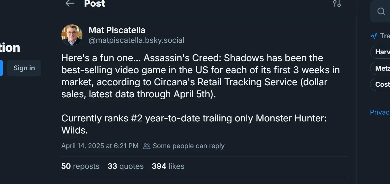 Assassinʼs Creed Shadows захватила чарты США, но уступила одной игре